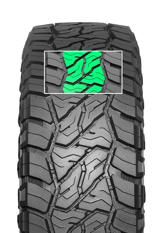 Одной из главных особенностей новинки является оптимизация протекторного рисунка, созданного для уверенного прохождения бездорожья. Плечи с пилообразными кромками и различной высотой улучшают контакт на рыхлых поверхностях, а многоугольные ламели в центральной зоне увеличивают связь на снегу и каменистом покрытии. Инновационные вставки Rock Tie-Bar повышают жесткость и сопротивляемость протектора сдвигу, что особенно важно при агрессивной езде вне асфальтированного покрытия. Специальная форма подканавочных элементов, напоминающая трещины на земле, препятствует застреванию камней и сохраняет рабочие свойства даже после длительных нагрузок.